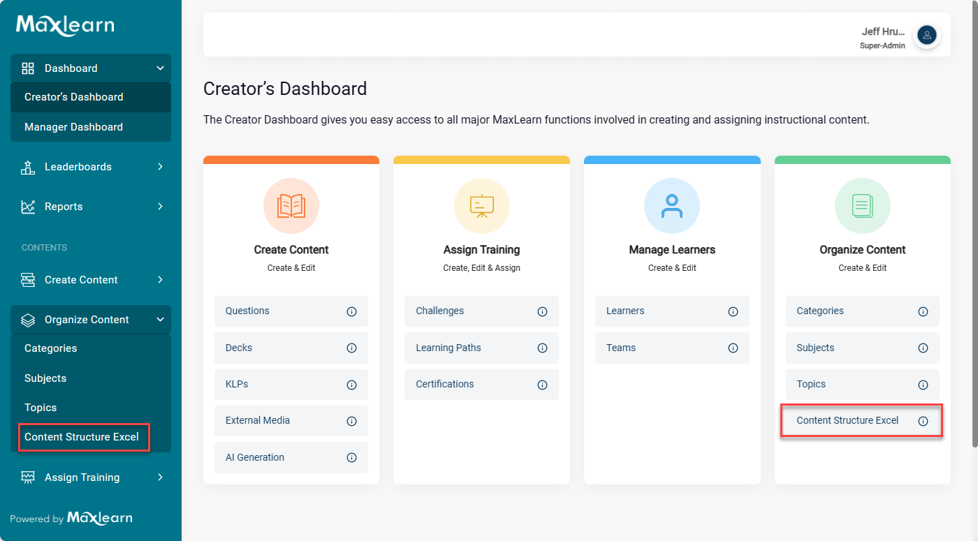 1. From the Creator's Dashboard or the left navigation, click on Content Structure Excel under Organize Content.