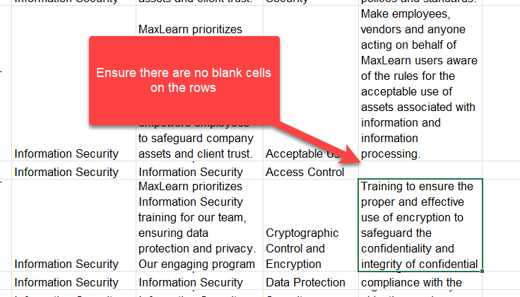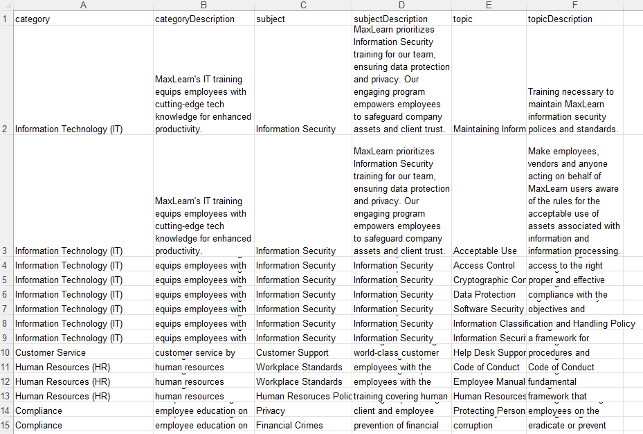 The image displayed above is an example of a content structure spreadsheet. It is important to note that some categories are repeated. Each category may consist of several associated subjects and topics. When the spreadsheet is uploaded, only one listing of the category or subject will be displayed. However, for the purpose of the spreadsheet, each subject and topic should be associated with a category and topic.