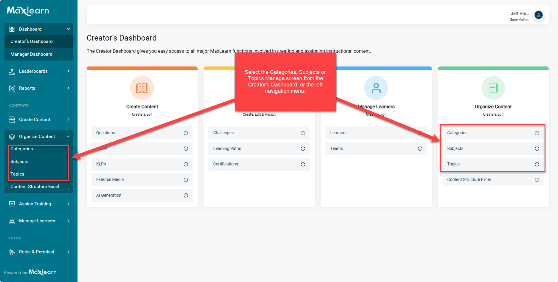 MaxLearn content is organized by Categories, Subjects, and Topics.